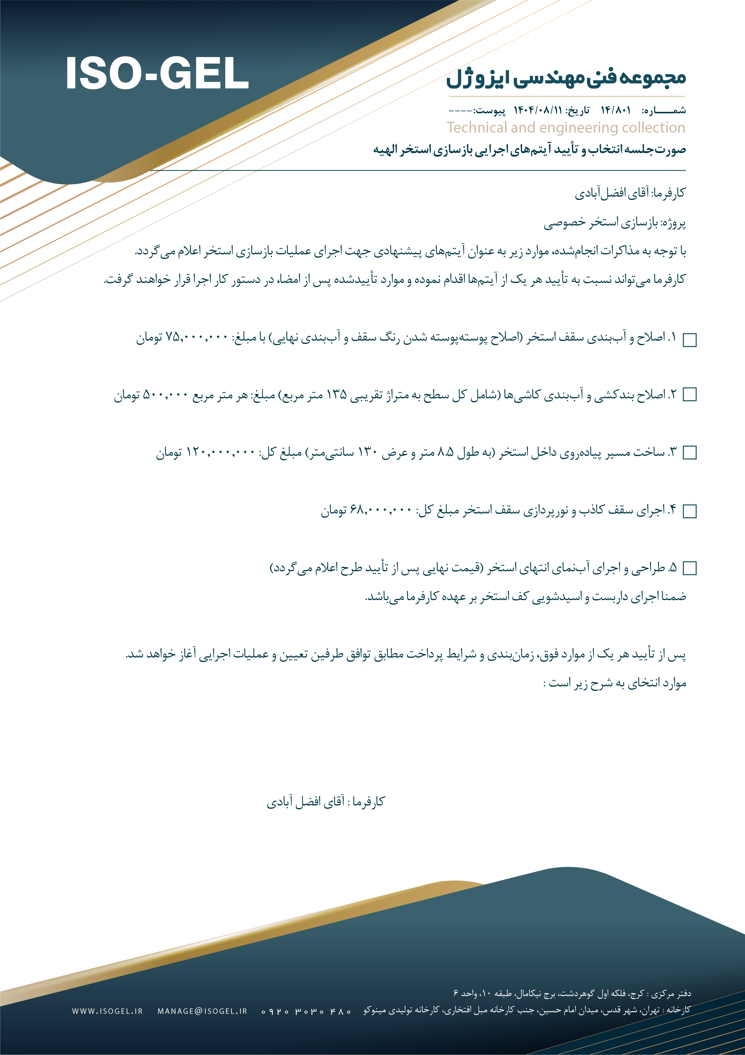 طی تبلیــــغات پیامکی مجــــــموعه فنی و مهندسی ایزوژل مبنی بر طراحی و اجرا و بازســــازی سازههای آبی تفریحی و استـــــــخرهای شـــــــنا، جـــــناب آقای افضلآبادی برای اصــــلاح و بازسـازی استخر باغ ـ ویلای خود واقع در شهرک الهیه کرج به ما مراجعه نمودند. تیم فنی و مهندسی مجموعه ایزوژل پس از بازدید از پروژه، پیشنهادات خود را به شرح ذیل اعلام نمودند که مورد موافقت کارفرما قرار گرفت.